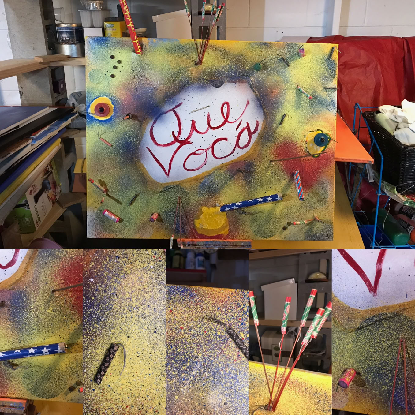 Mixed media: Acrylic, ink, spray foam, spray paint, Flex Seal and fireworks on canvas.