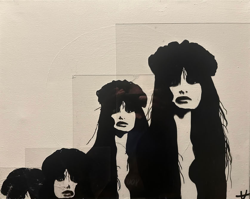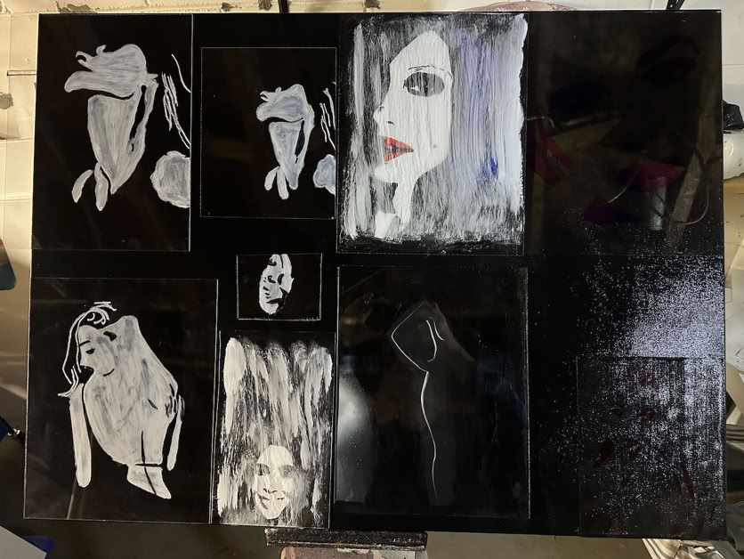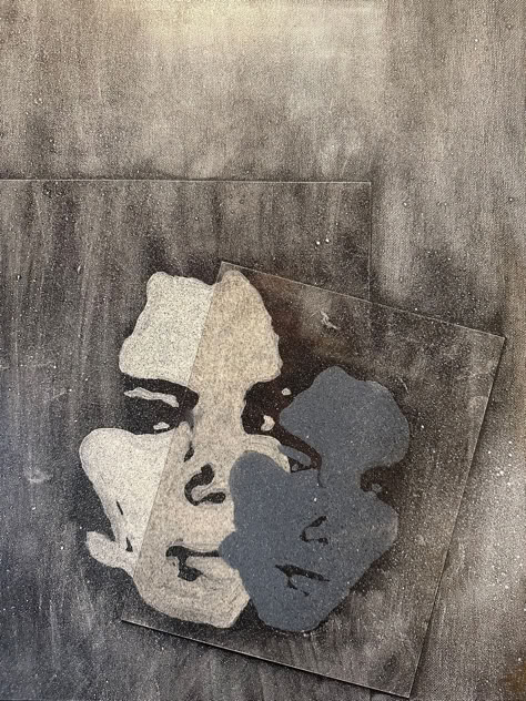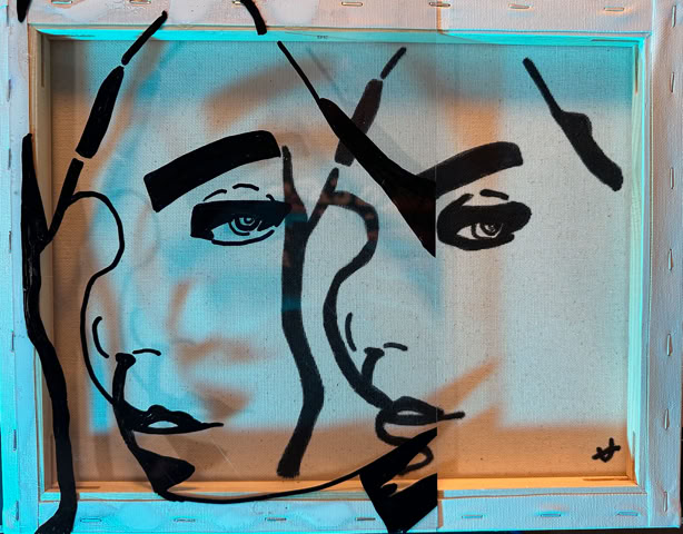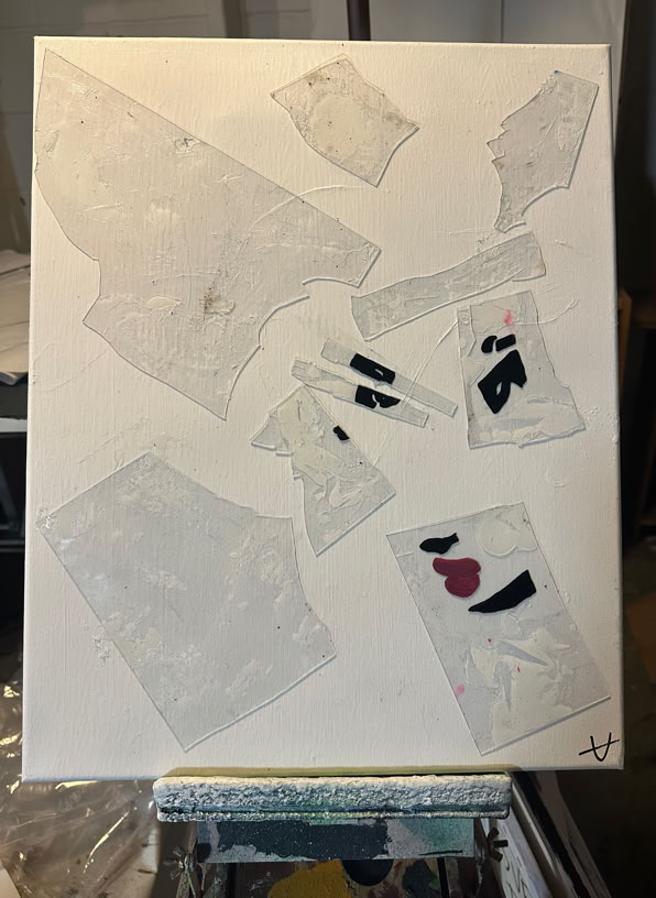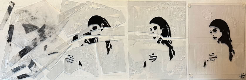 Glass and plexiglass build over each other and blend on canvas with basic colors while an image breaks or repeats, distorting itself while revealing the honesty of us.