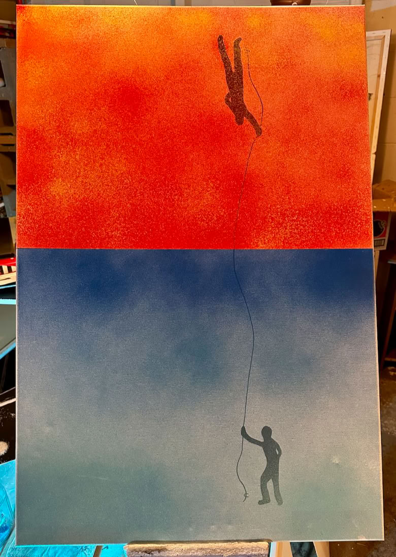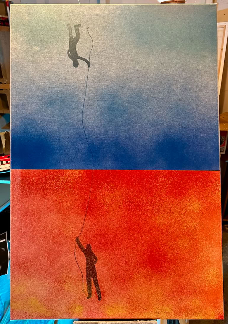 Ink and spray paint on canvas.