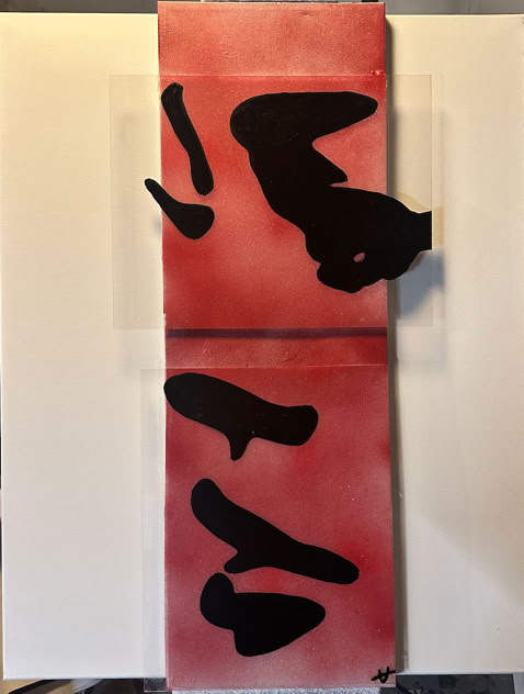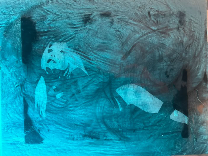 Glass and plexiglass build over each other and blend on canvas with basic colors while an image breaks or repeats, distorting itself while revealing the honesty of us.
