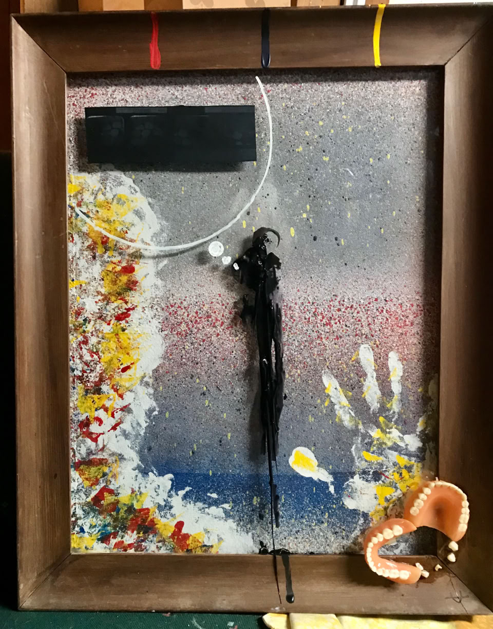 Mixed media: Window, gloss enamel, oil, acrylic, spray paint, Flex Seal on canvas.